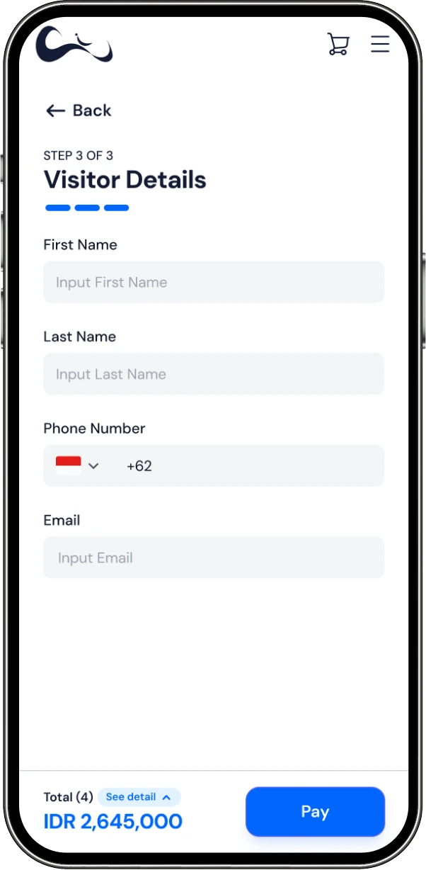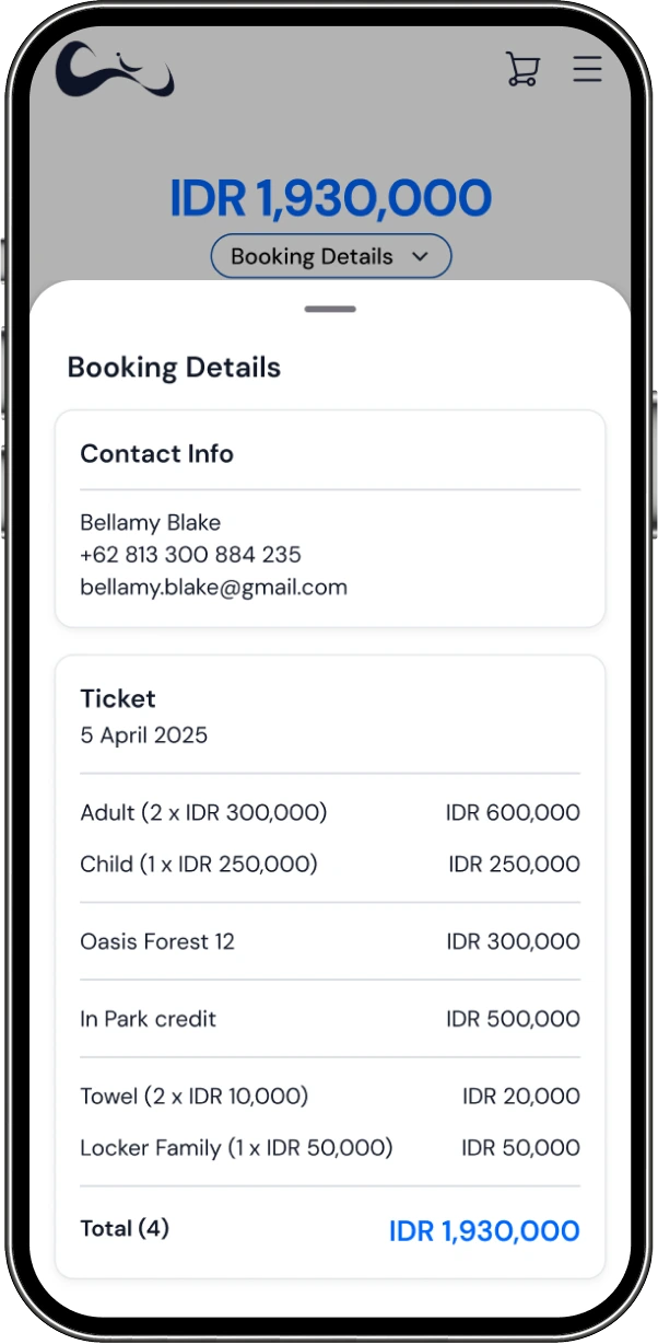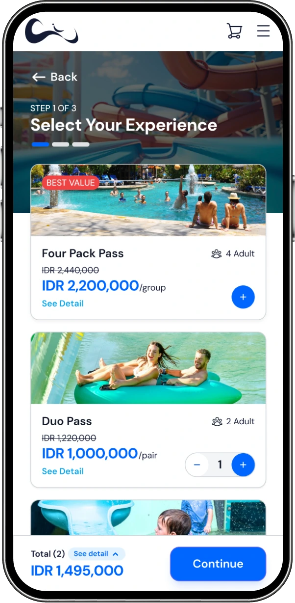 The current Waterbom Bali ticket purchase page presents all booking step (ticket selection, date, contact information, add-on, order summary and payment method) vertically long mobile page. While functional, this layout creates cognitive overload and friction for mobile users.